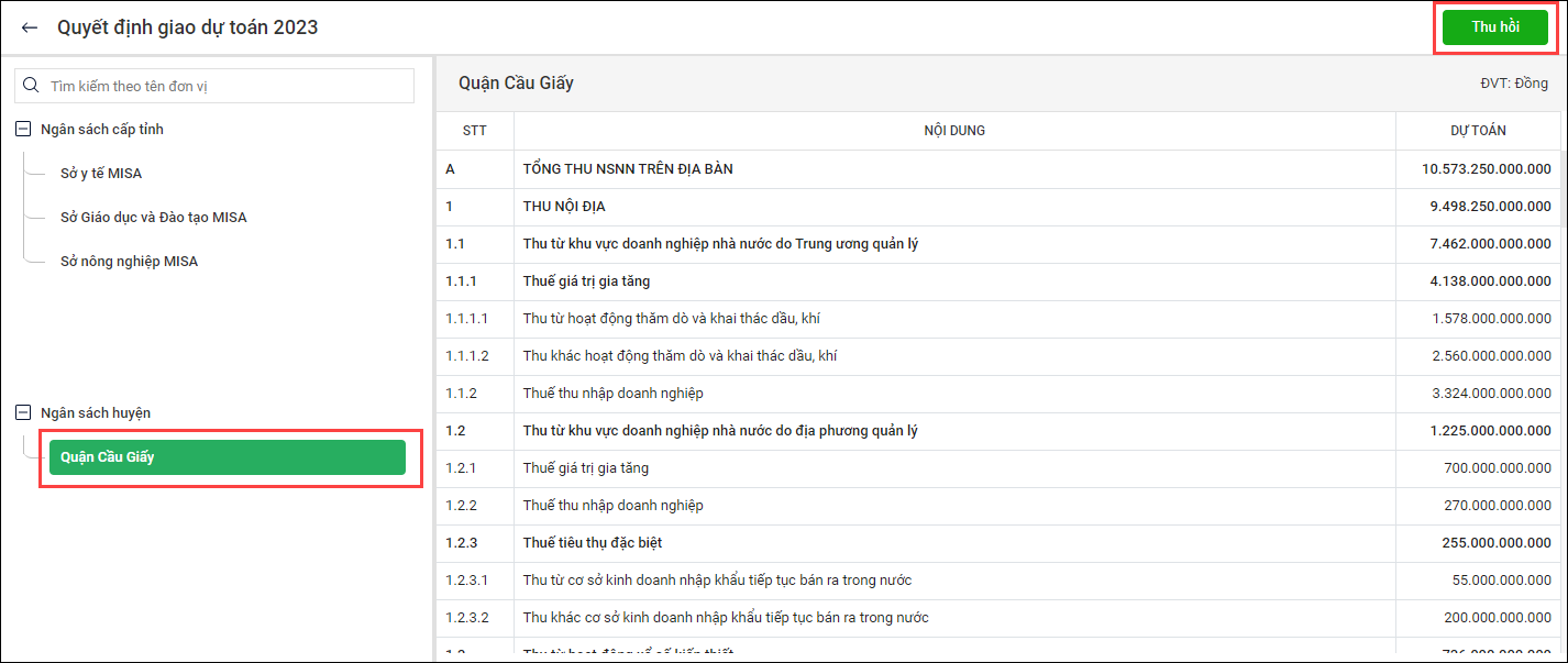 Ví dụ: Tại Quận Cầu giấy chọn Thu hồi lúc này toàn bộ dự toán của cấp tỉnh và cấp Huyện đã được ban hành xuống sẽ được thu hồi.