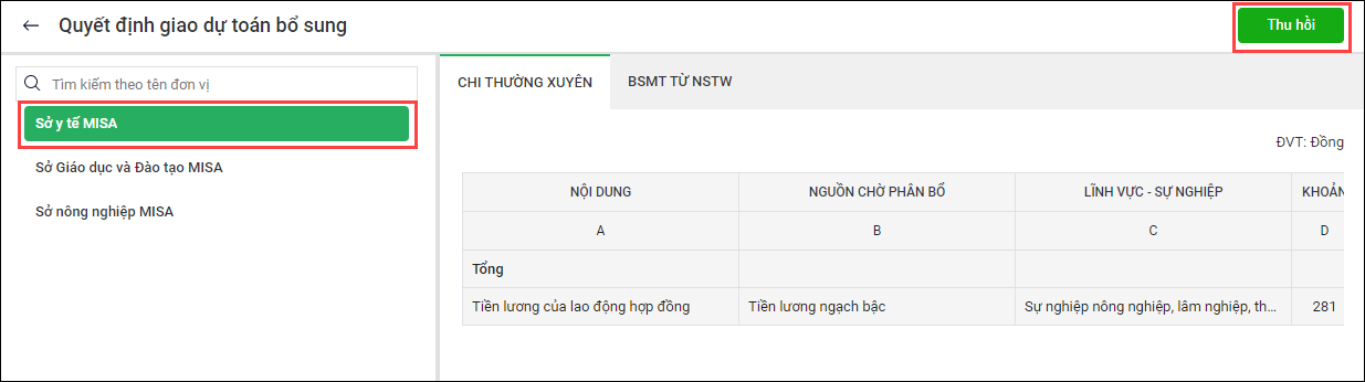 Ví dụ: Tại Sở y tế Misa chọn Thu hồi lúc này toàn bộ dự toán của cấp tỉnh và cấp Huyện đã được ban hành xuống sẽ được thu hồi.