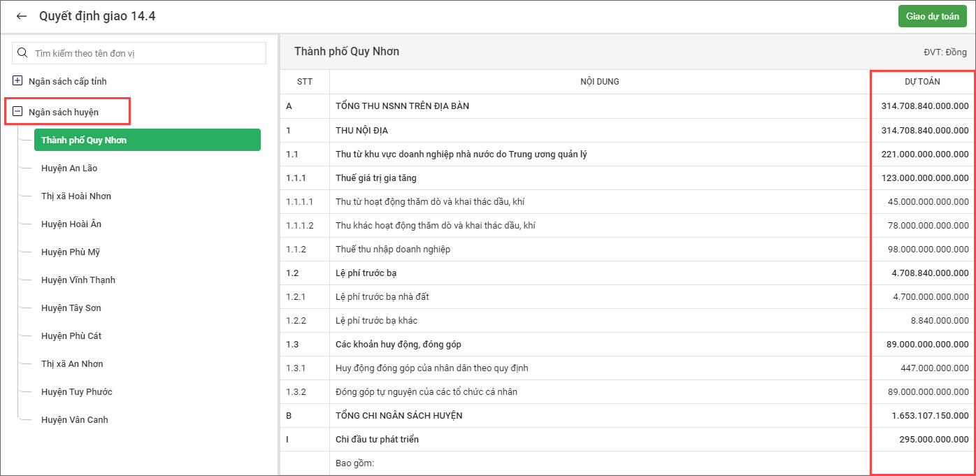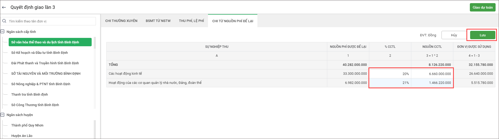 4. Nhập số phân bổ giao cho các đơn vị thuộc ngân sách cấp tỉnh, và xem số phân bổ giao cho các đơn vị thuộc ngân sách cấp huyện.