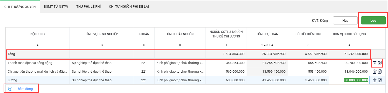• Nhấn Thêm dòng hoặc Nhân bản để thêm nội dung cần phân bổ, nếu muốn xóa nội dung đó đi nhấn vào biểu tượng thùng rác.