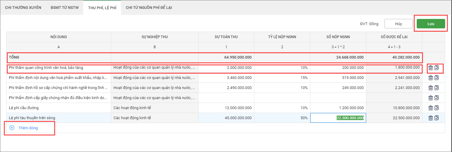 • Nhập số Dự toán thu, Nhập tỷ lệ nộp NSNN. Phần mềm sẽ tự động tính Số nộp NSNN, Số được để lại Tổng.