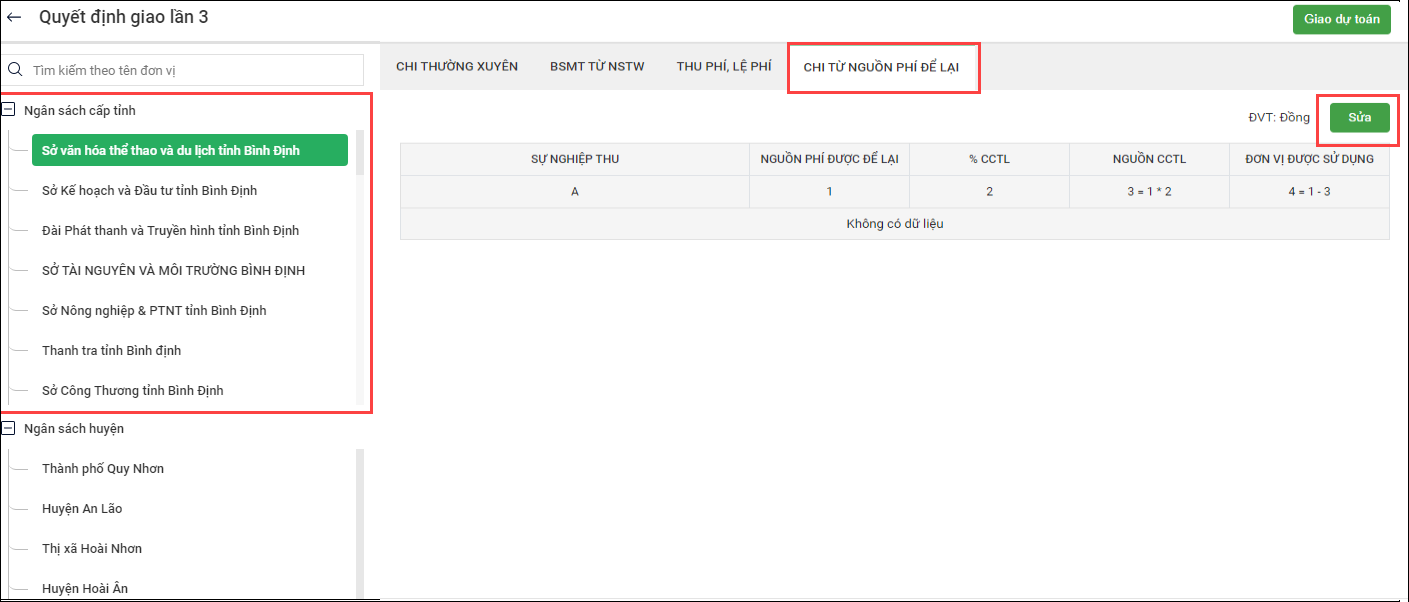• Chọn tab Chi từ nguồn phí để lại. Nhấn Sửa.