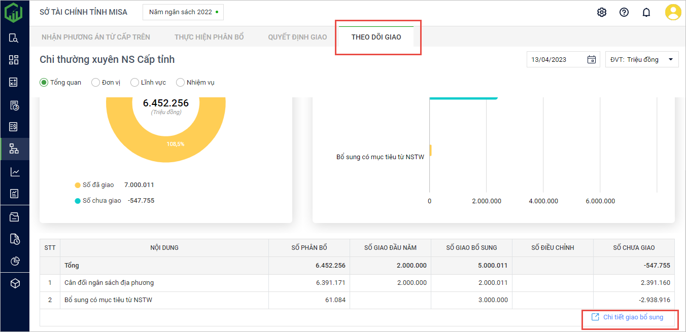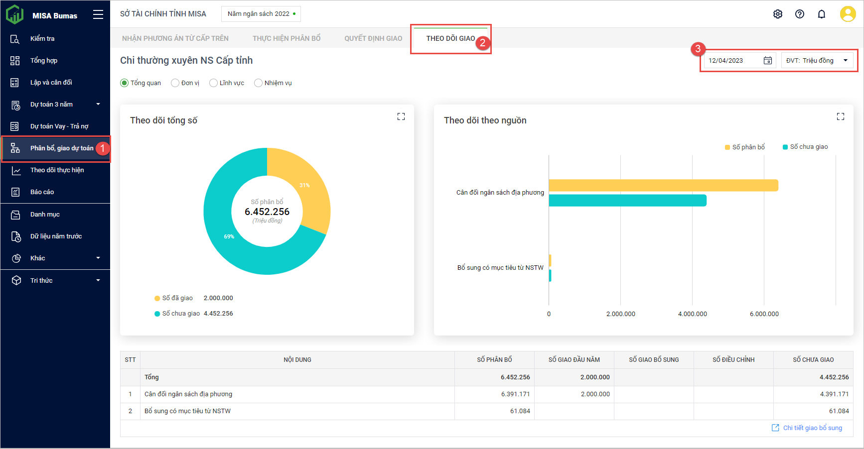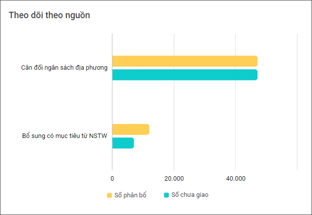 - Biểu đồ dạng cột nằm ngang Theo dõi theo nguồn: Xem được Số phân bổ (màu vàng) và Số chưa giao (màu xanh) theo nguồn: Cân đối ngân sách địa phương và Bổ sung có mục tiêu từ NSTW.