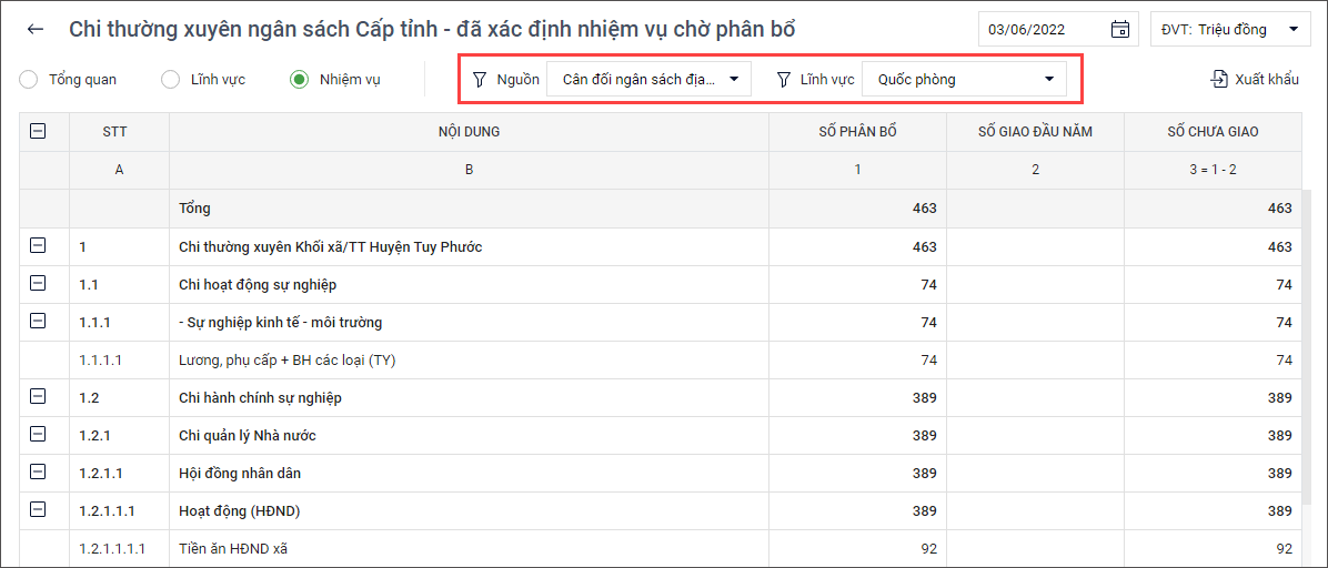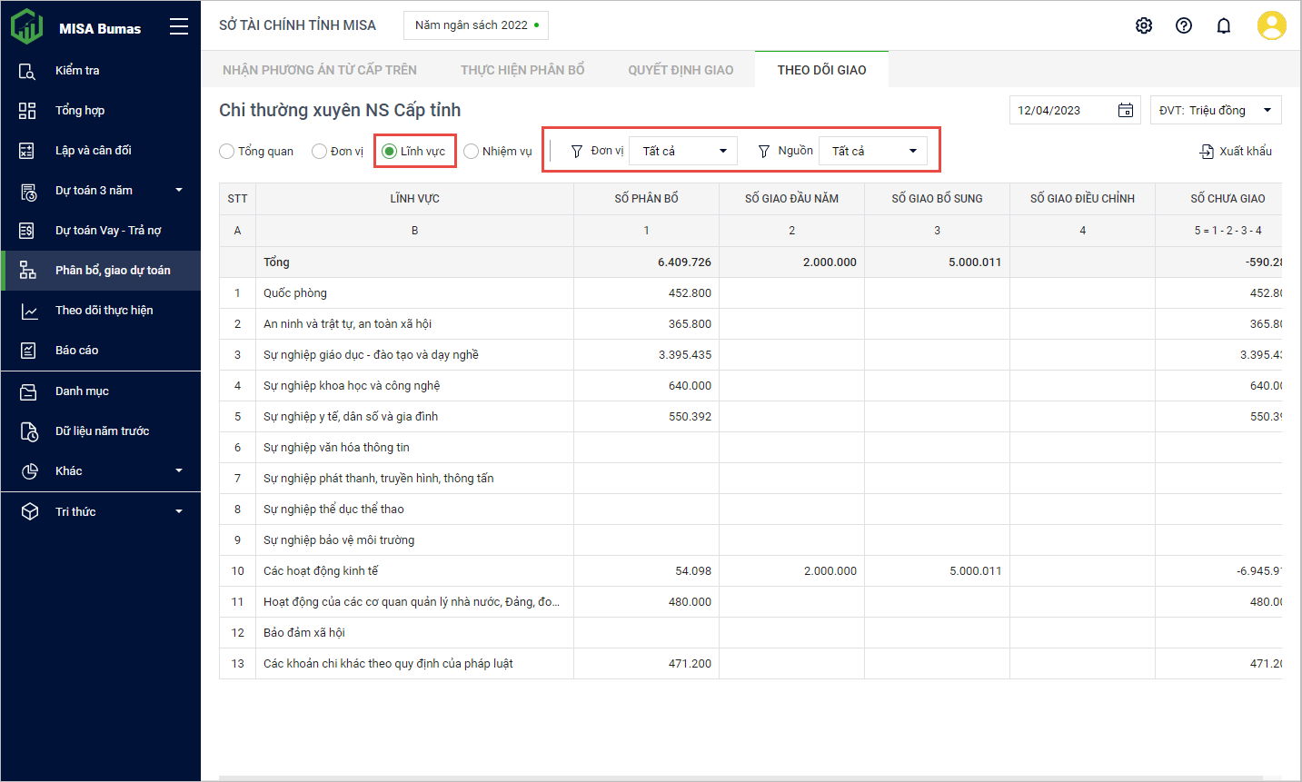 III. Xem số phân bổ, số giao đầu năm, số chưa giao theo lĩnh vực