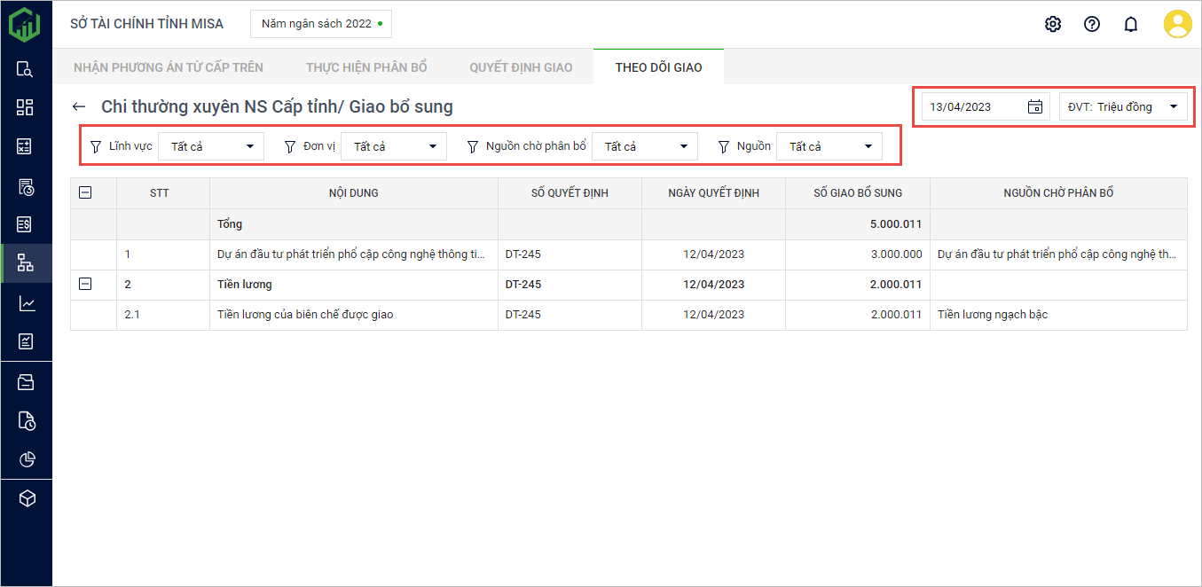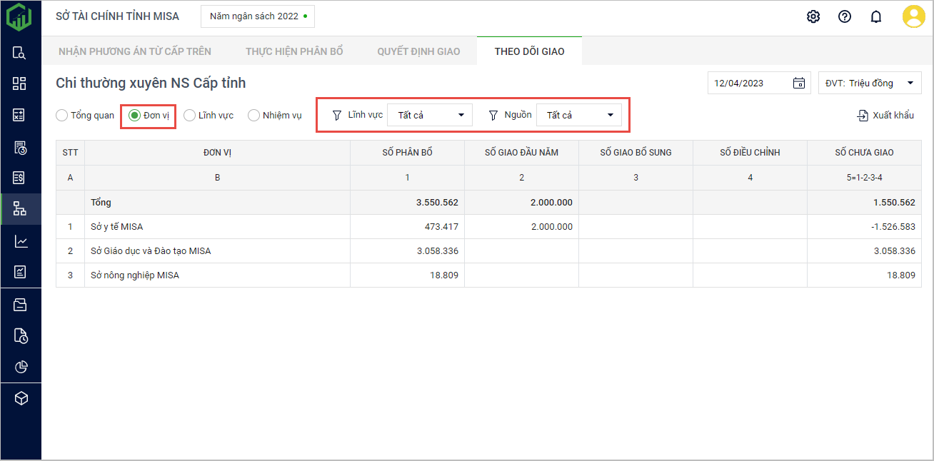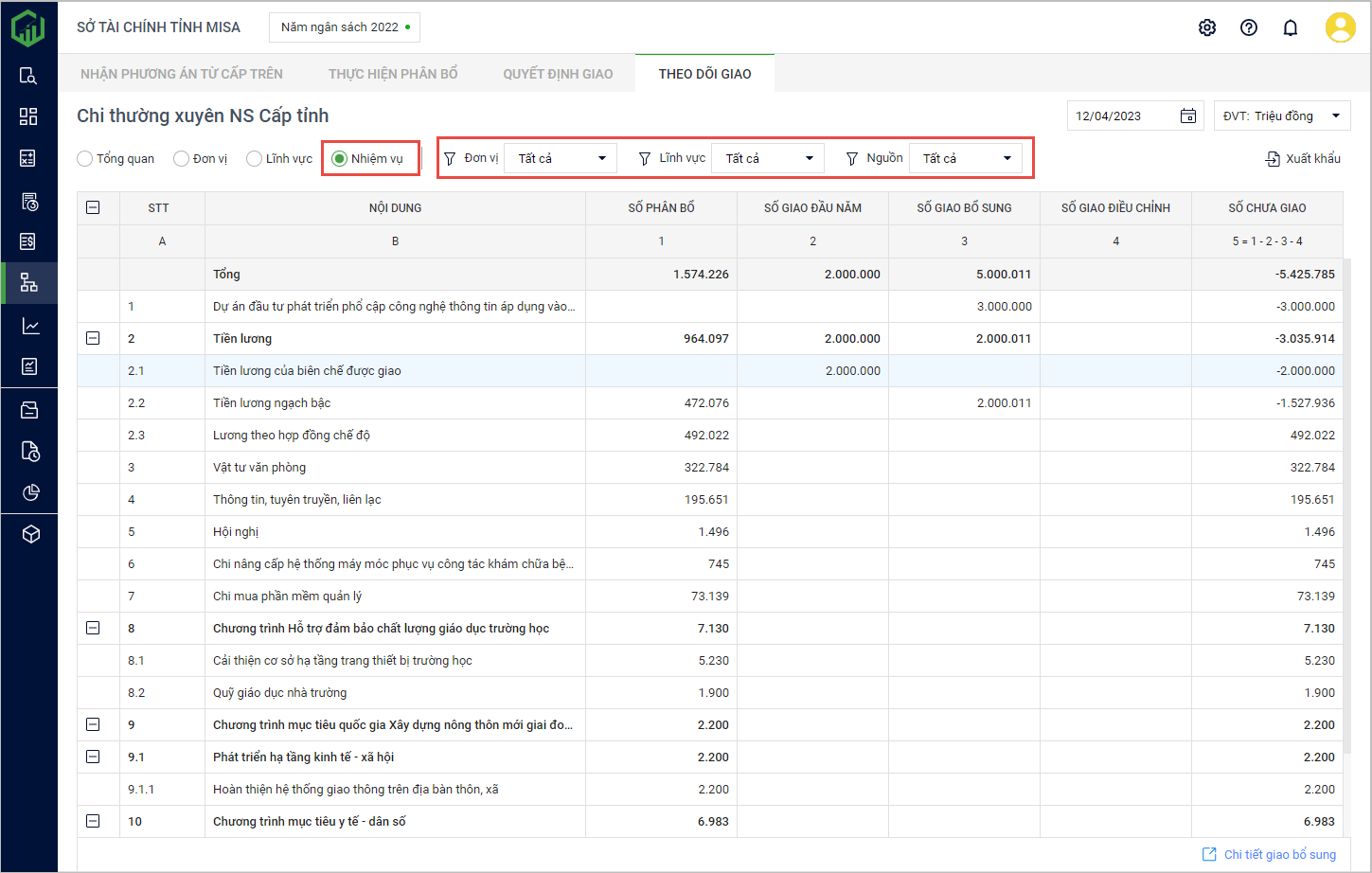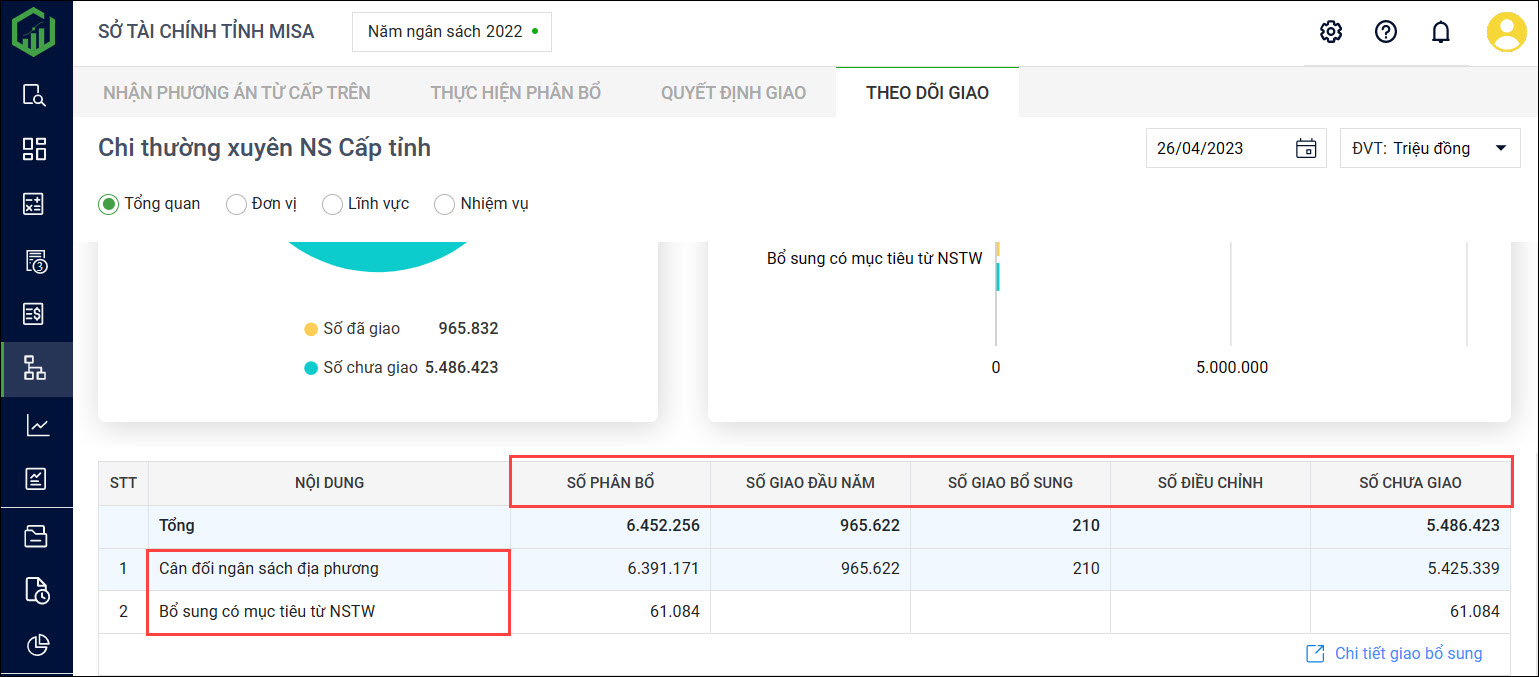 Giúp Sở tài chính (STC) thực hiện theo dõi số liệu phân bổ, số đã giao đầu năm và số chưa giao cho các đơn vị cấp dưới.