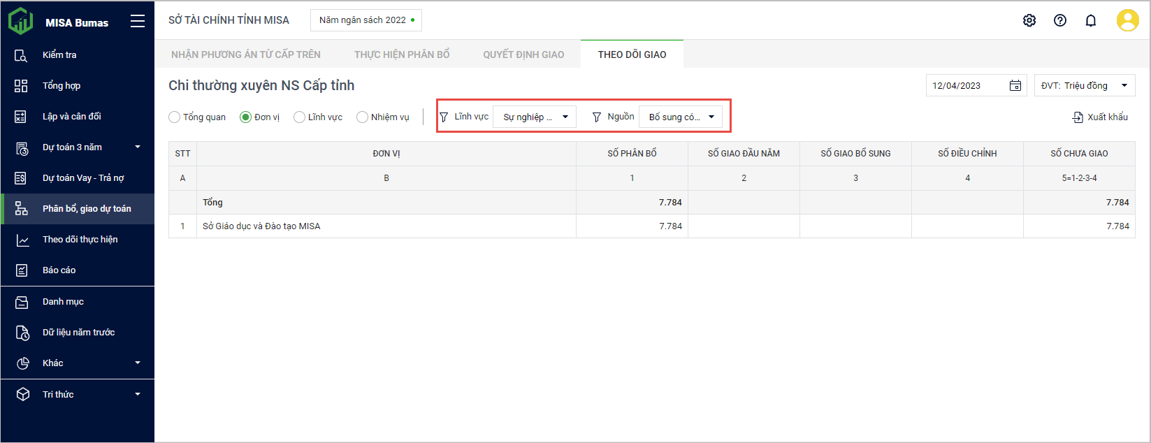 Ví dụ: Theo dõi giao các đơn vị có phát sinh dự toán phân bổ tại lĩnh vực Sự nghiệp giáo dục – đào tạo và dạy nghề và nguồn Bổ sung có mục tiêu từ NSTW.