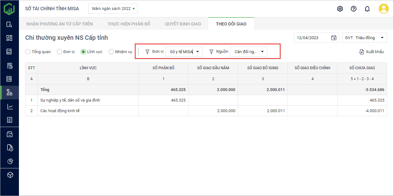Ví dụ: Theo dõi giao các lĩnh vực có phát sinh dự toán phân bổ tại đơn vị Sở y tế MISA, nguồn Bổ sung có mục tiêu từ NSTW.