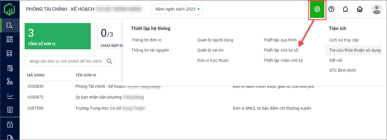 Vào Thiết lập, chọn Thiết lập chữ ký số.