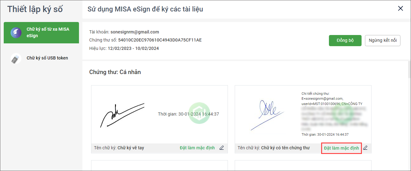 4. Hệ thống tự động lấy lên các chữ ký số từ MISA eSign. Nhấn Đặt làm mặc định tại chữ ký số muốn sử dụng.