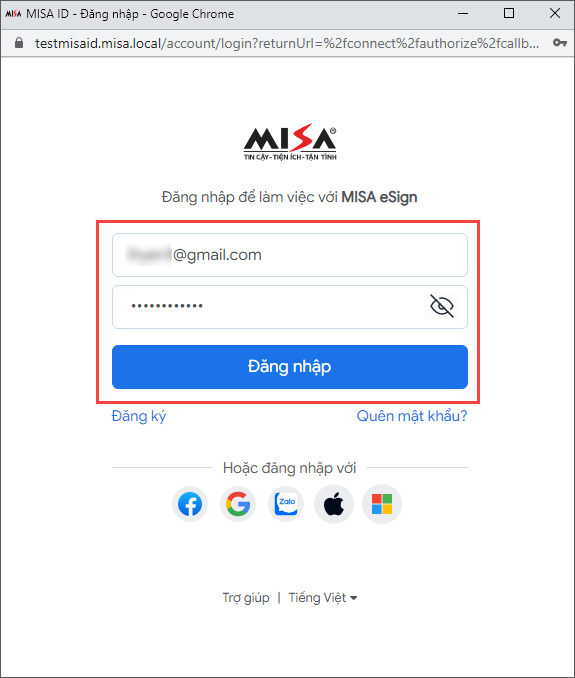 2. Nhập thông tin đăng nhập vào MISA eSign. Nhấn Đăng nhập.