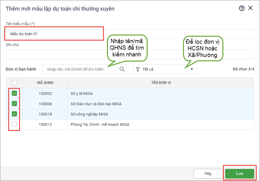 Lưu ý: Có thể tìm kiếm nhanh đơn vị bằng cách nhập Tên/Mã QHNS vào ô tìm kiếm. Hoặc tích chọn vào bộ lọc để lọc các đơn vị Xã/Phường hoặc HCSN