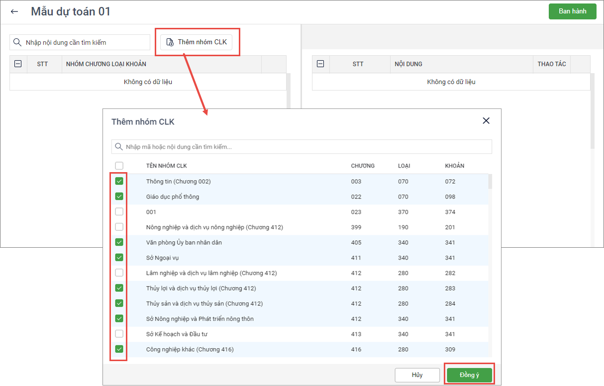 *Lưu ý: Nếu đơn vị không tìm thấy Nhóm Chương – Loại – Khoản, do đơn vị ngưng sử dụng danh mục đó. Để thiết lập lại danh mục Nhóm Chương – Loại – Khoản, anh/chị xem hướng dẫn Tại đây.