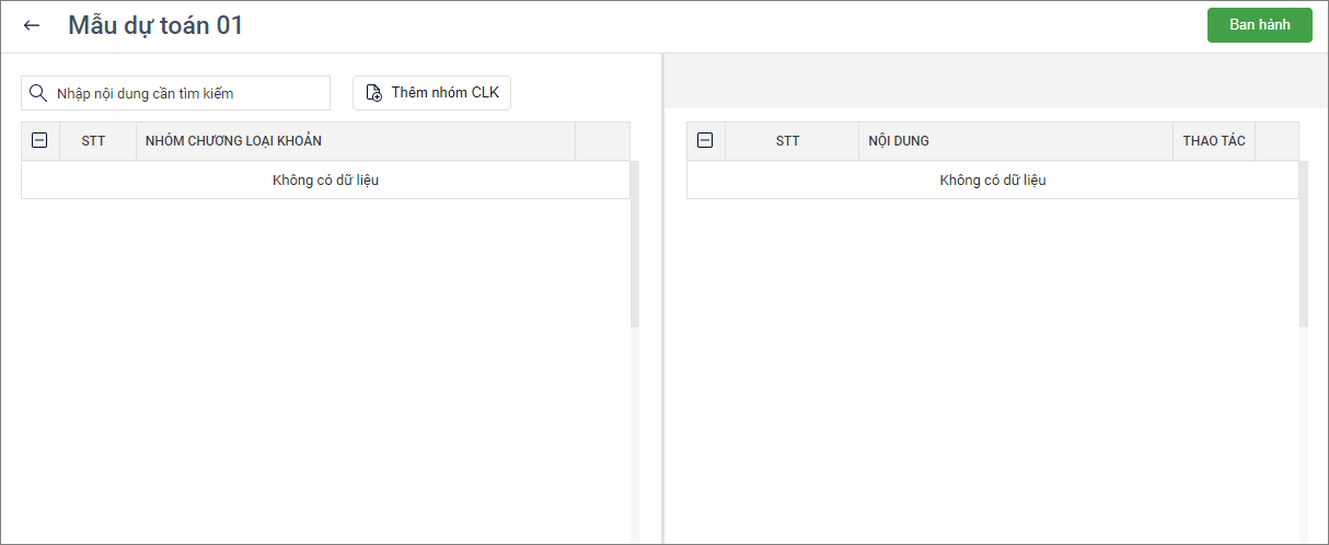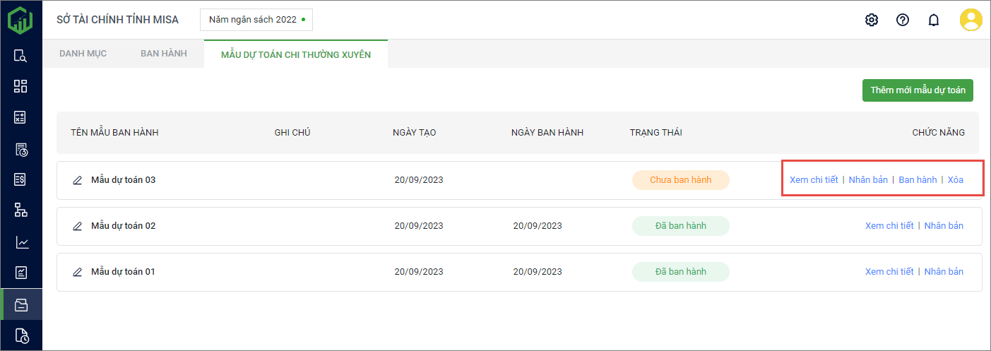 11. Nhấn Nhân bản để thêm nhanh Mẫu dự toán chi thường xuyênNhấn Xem chi tiết để xem Mẫu dự toán chi thường xuyên.