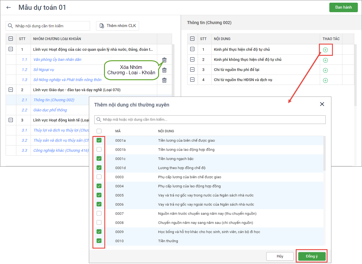 12. Để xóa Mẫu dự toán chi thường xuyên anh/chị nhấn vào Xóa.