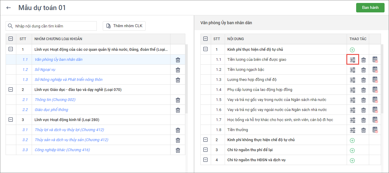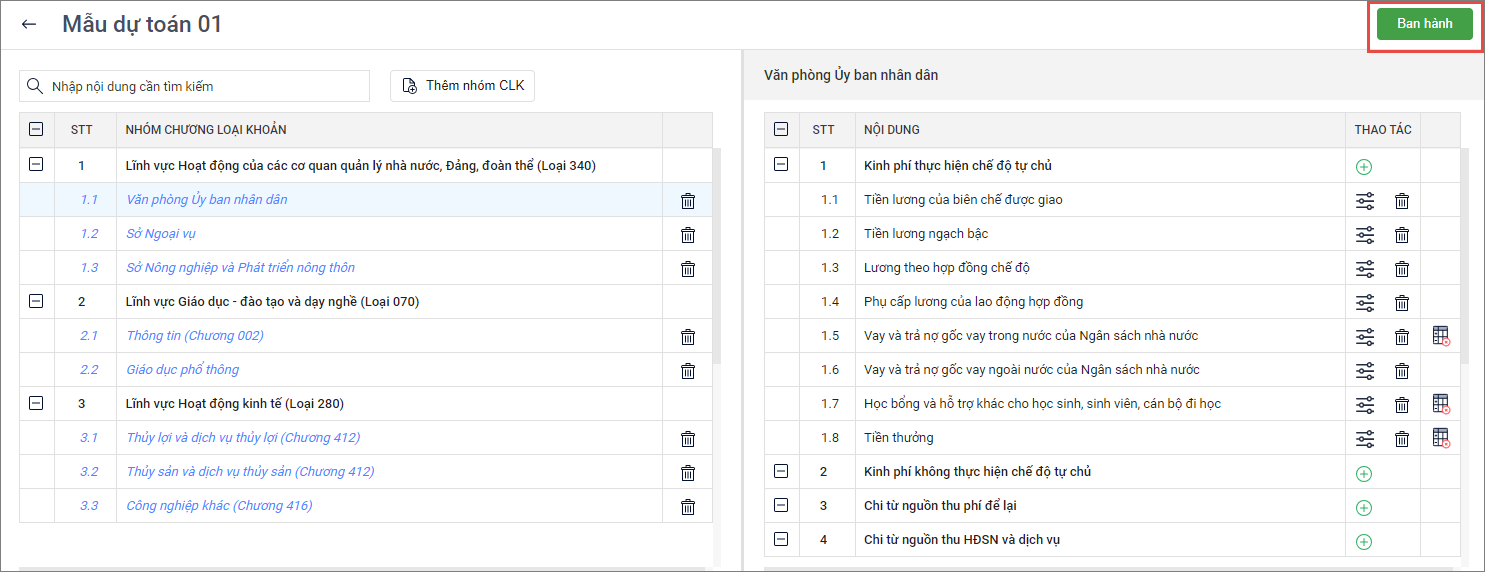 10. Nhấn Ban hành để ban hành Mẫu dự toán chi thường xuyên cho đơn vị cấp dưới. Trạng thái của Mẫu dự toán chi thường xuyên chuyển thành Đã ban hành.