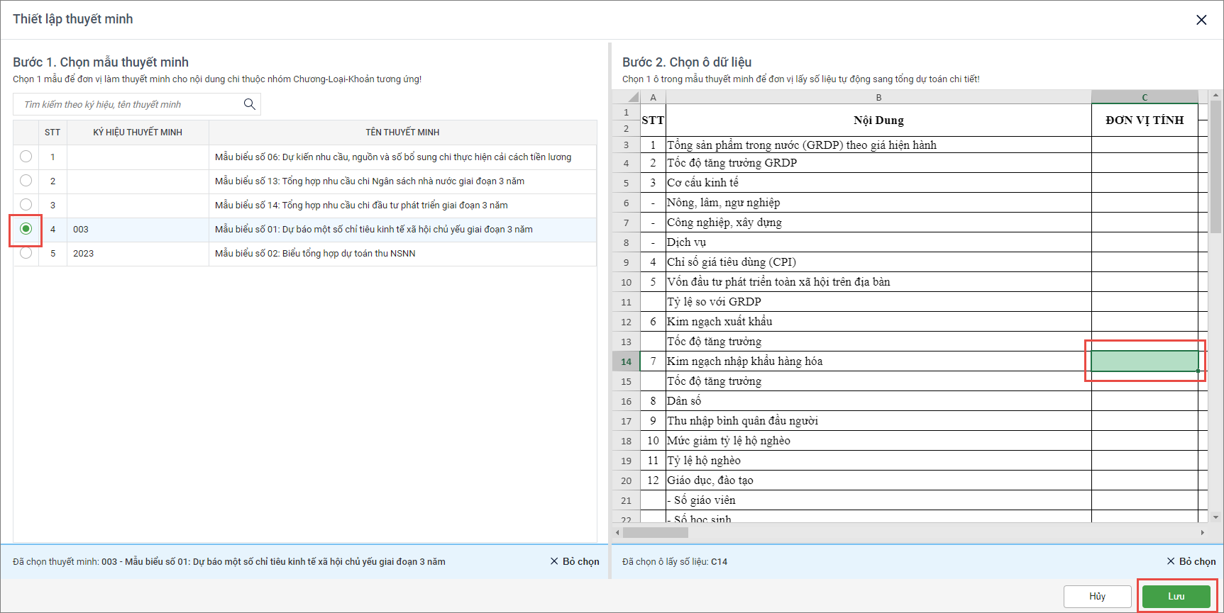 • Chọn 1 ô (ô này sẽ được sử dụng để đơn vị cấp dưới lấy số liệu từ tab thuyết minh sang tab dự toán chi tiết).