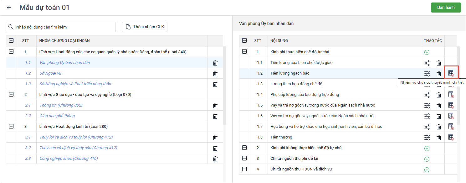 • Với những nhiệm vụ chi chưa có thuyết minh chi tiết phần mềm sẽ hiển thị thông báo cạnh nhiệm vụ chi.