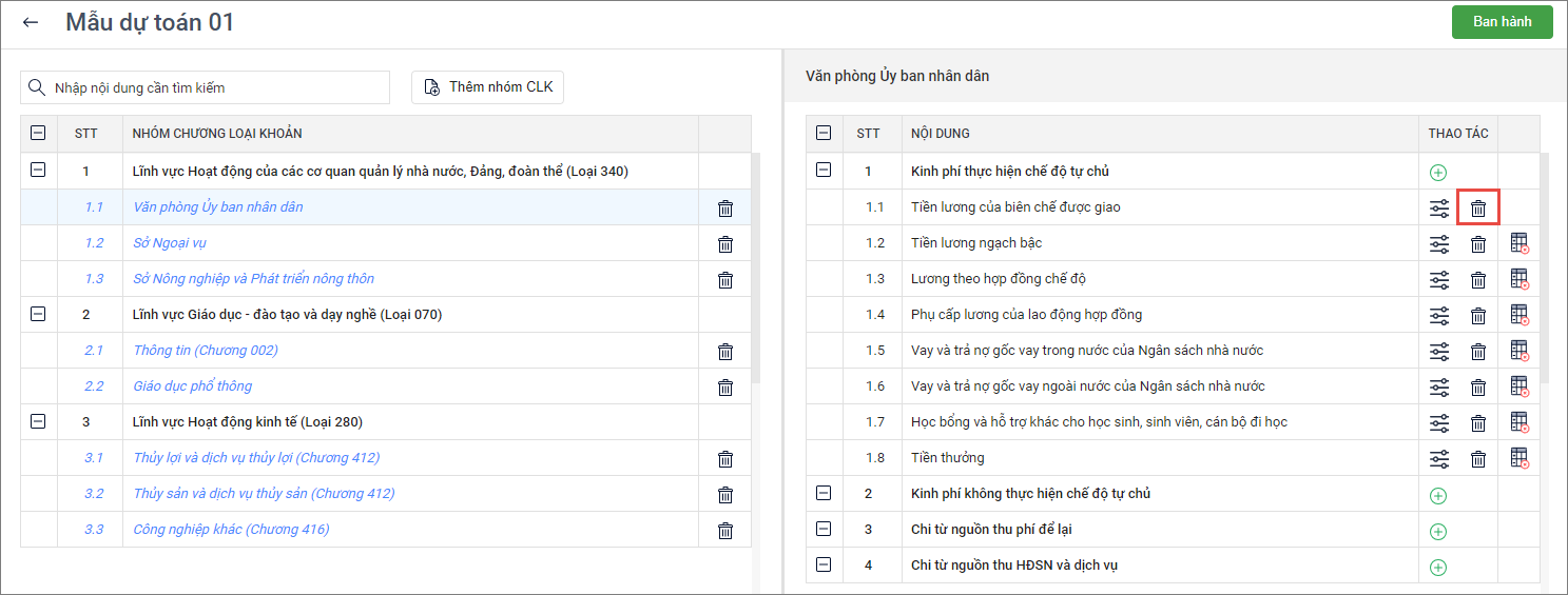 8. Để xóa nhiệm vụ Chi thường xuyên cho nhóm Chương – Loại – Khoản, nhấn vào biểu tượng thùng rác cạnh nhiệm vụ cần xóa.