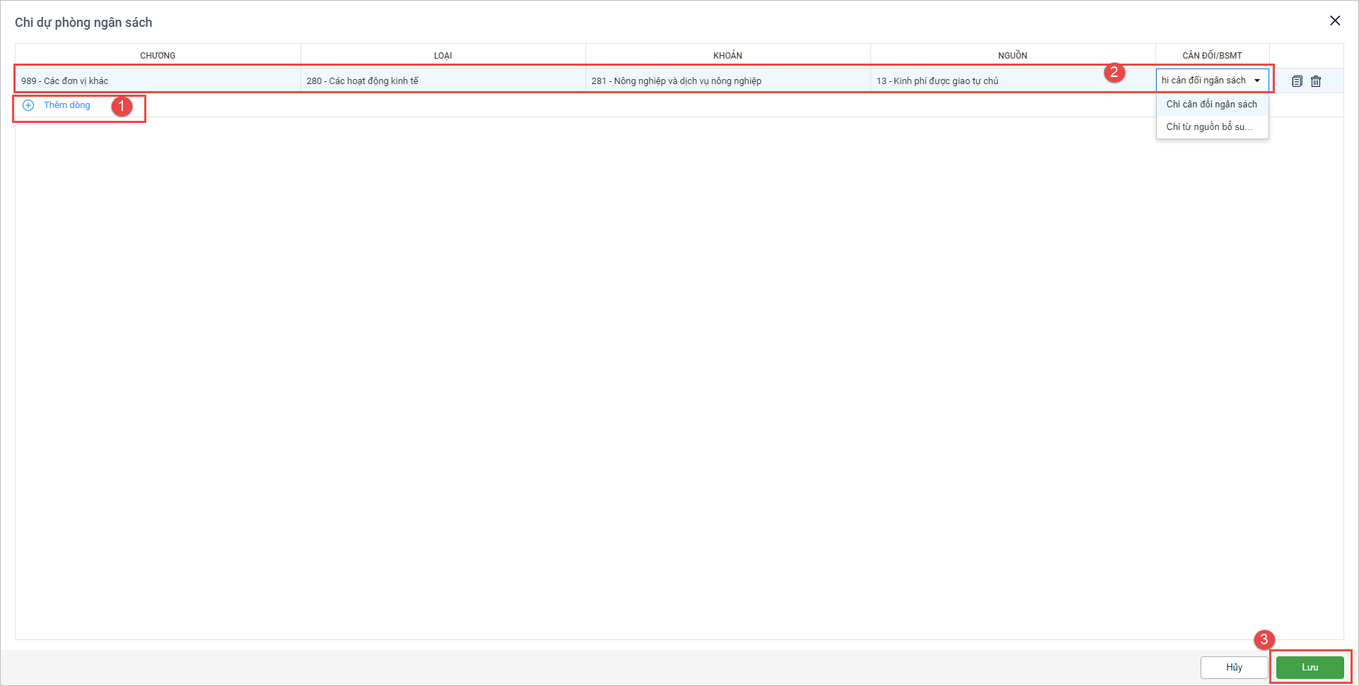 - Nếu anh/chị muốn thêm một dòng chi tiết cho nội dung chi này có thể nhấn Thêm dòng hoặc Nhân bản.