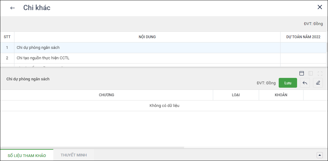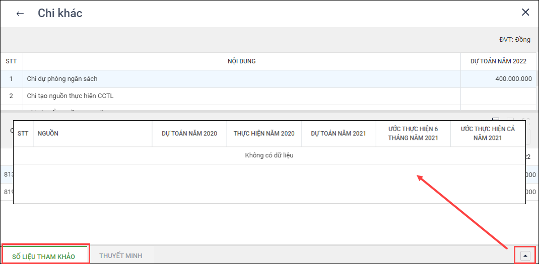 - Để có căn cứ lập dự toán cho từng nhiệm vụ chi năm kế hoạch, anh/chị có thể tham khảo số liệu năm trước tại tab Số liệu tham khảo, bằng cách chọn dấu mũi tên, chọn tab Số liệu tham khảo để xem.
