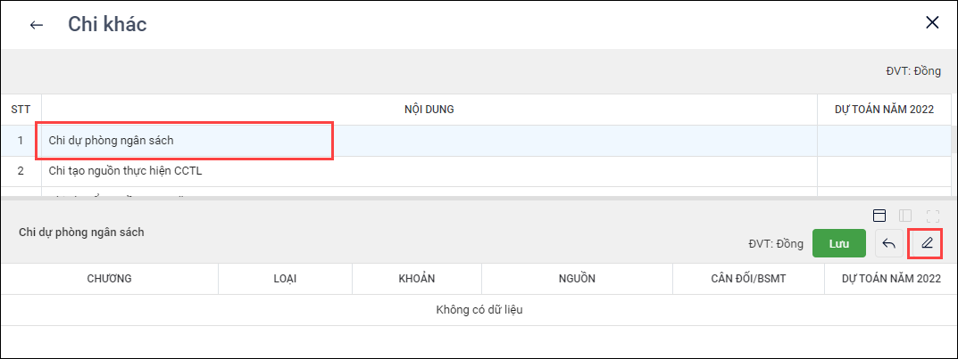 - Nhấn vào biểu tượng cây bút để lập dự toán cho nội dung chi.