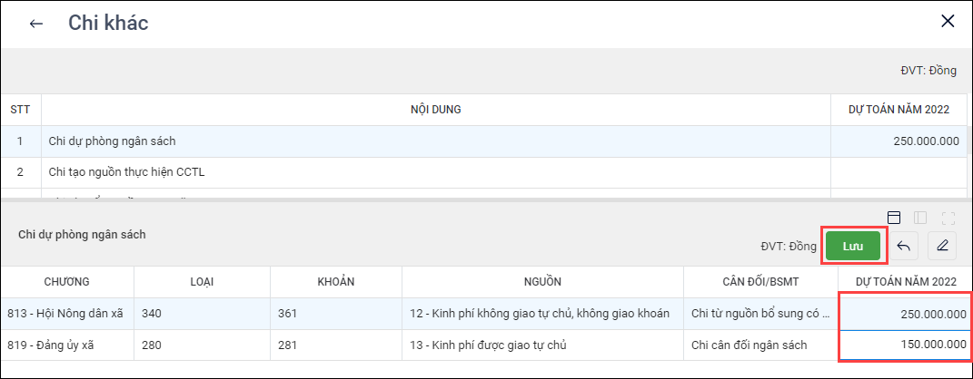 - Nhập Dự toán cho năm kế hoạch, nhấn Lưu.