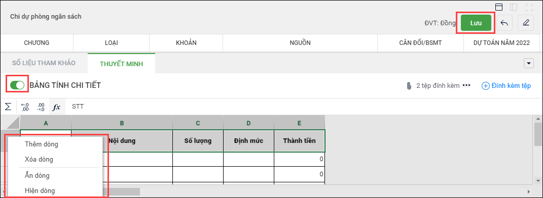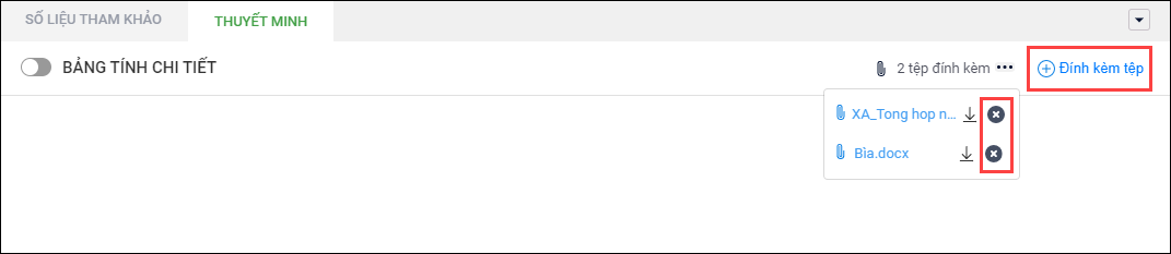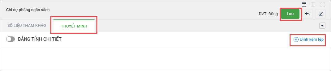 - Để thuyết minh số liệu cho nội dung chi, chọn tab Thuyết minh, chọn Đính kèm tệp, chọn tệp đính kèm, sau đó nhấn Lưu.