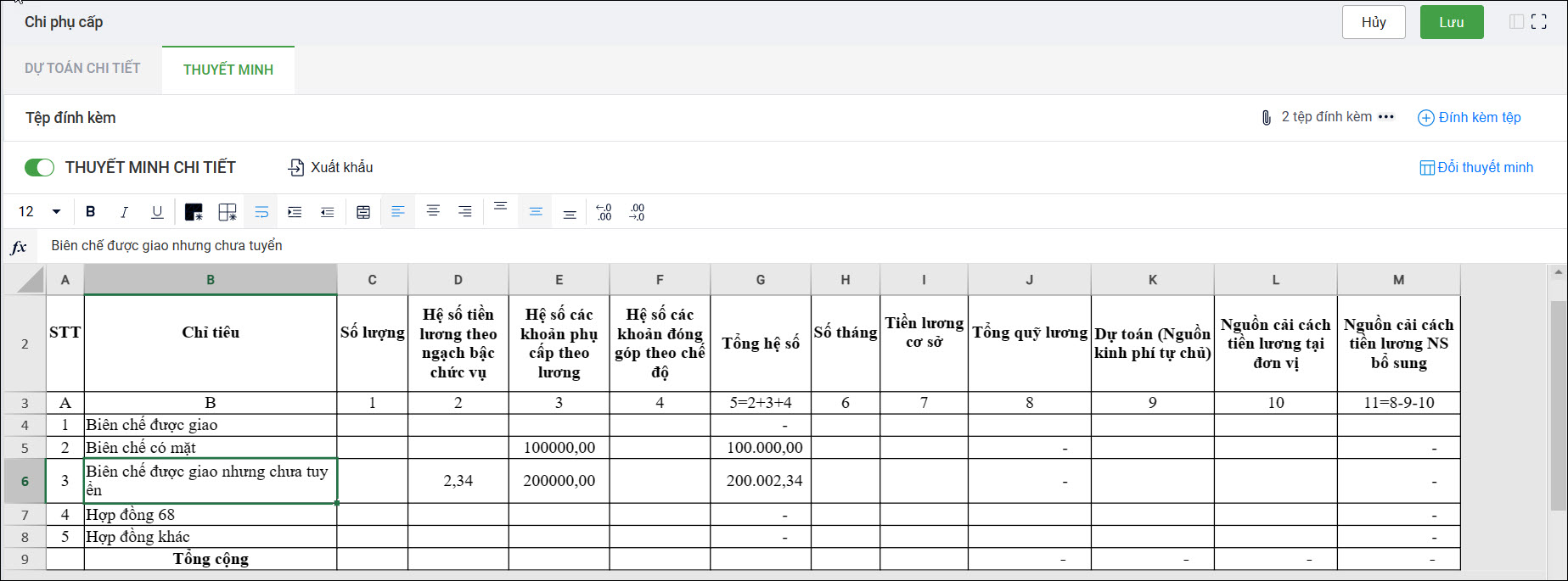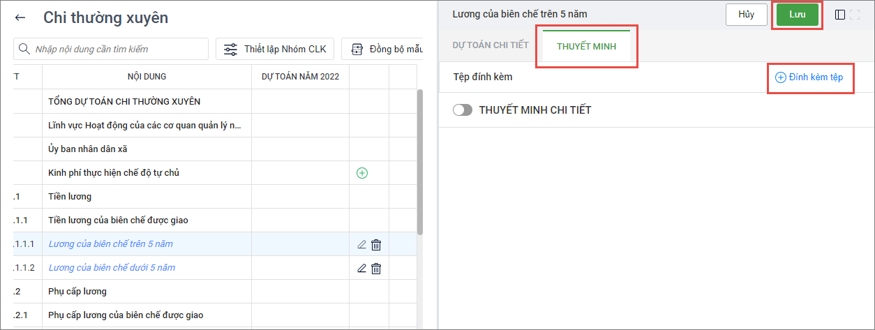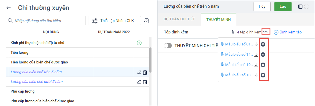 - Để thuyết minh số liệu cho nội dung chi, chọn Đính kèm tệp rồi chọn tệp đính kèm.