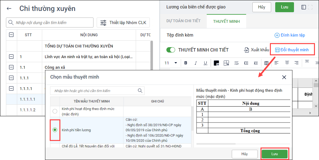 Lưu ý: Nếu Phòng tài chính đã thiết lập mẫu thuyết minh cho nhiệm vụ chi thì phần mềm sẽ lấy mẫu thuyết minh đó, anh/chị có thể chọn lại mẫu thuyết minh nếu muốn.