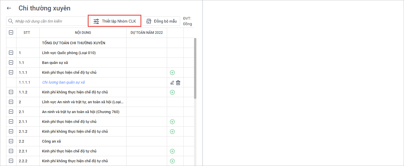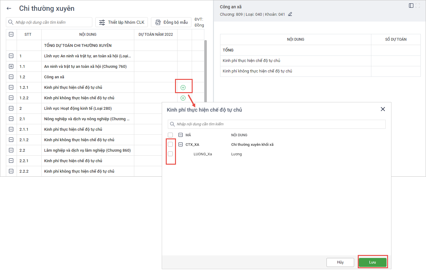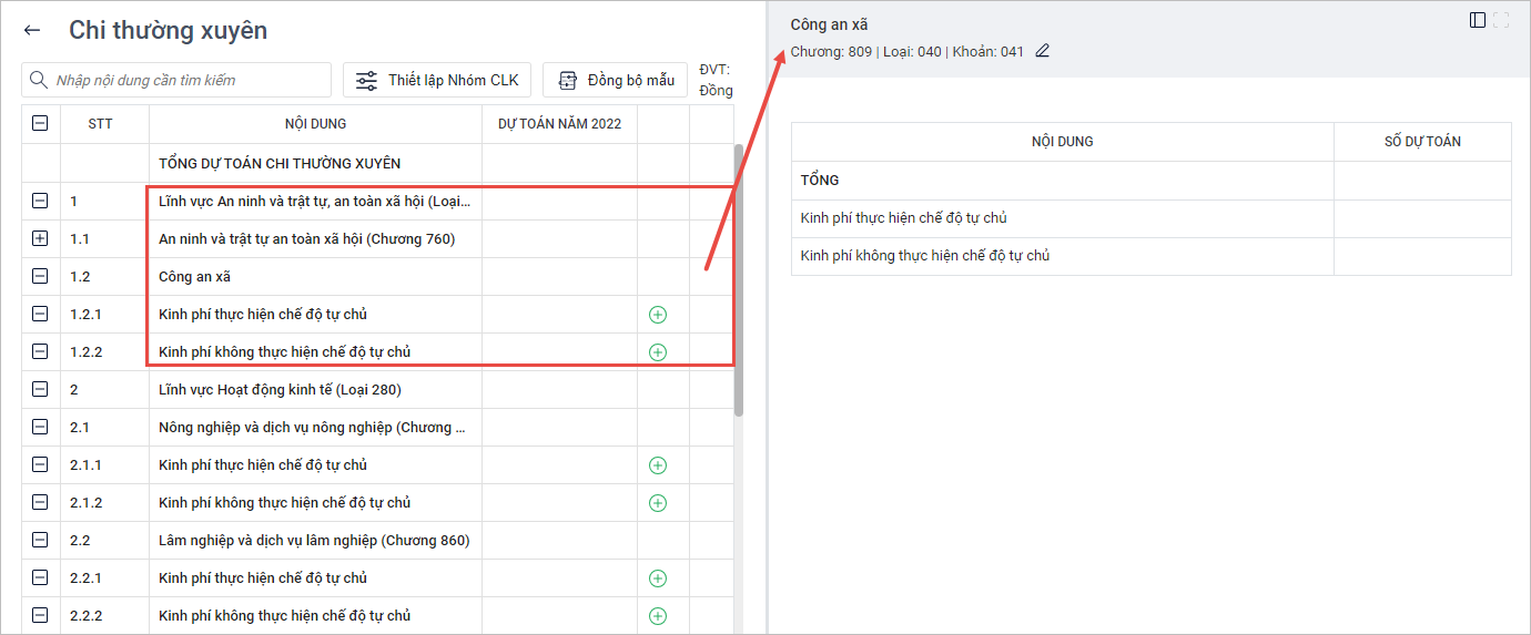 Ví dụ: Màn hình dưới đây lấy lên Lĩnh vực An ninh và trật tự an toàn xã hội (070) -> Công an xã (Chương 809, Loại 040, Khoản 041) -> 2 nhóm nội dung chính để lập dự toán gồm: Kinh phí thực hiện chế độ tự chủ và Kinh phí không thực hiện chế độ tự chủ.