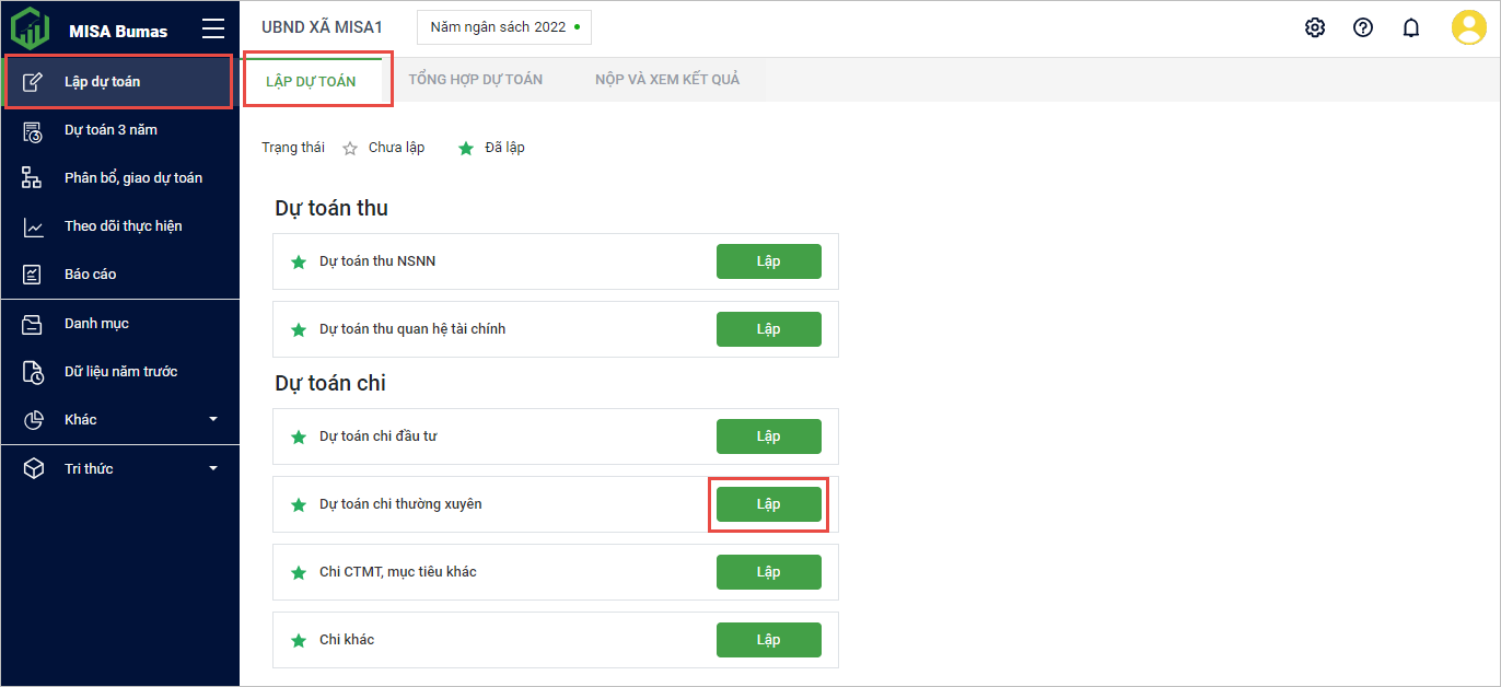 1. Vào menu Lập dự toán, chọn tab Lập dự toán, nhấn Lập tại Dự toán chi thường xuyên.
