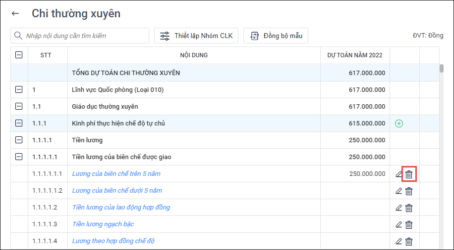 - Nhấn vào biểu tượng thùng rác tại nội dung chi cần xóa.