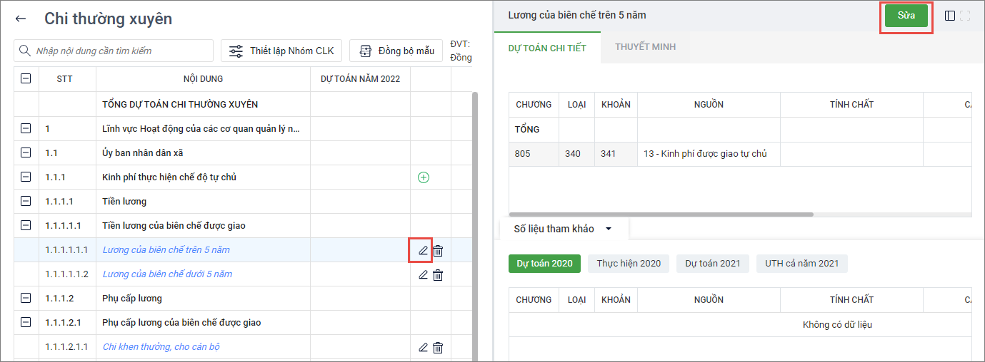 - Tích chọn vào biểu tượng cây bút hoặc Sửa tại nội dung cần lập dự toán.