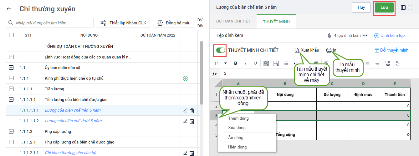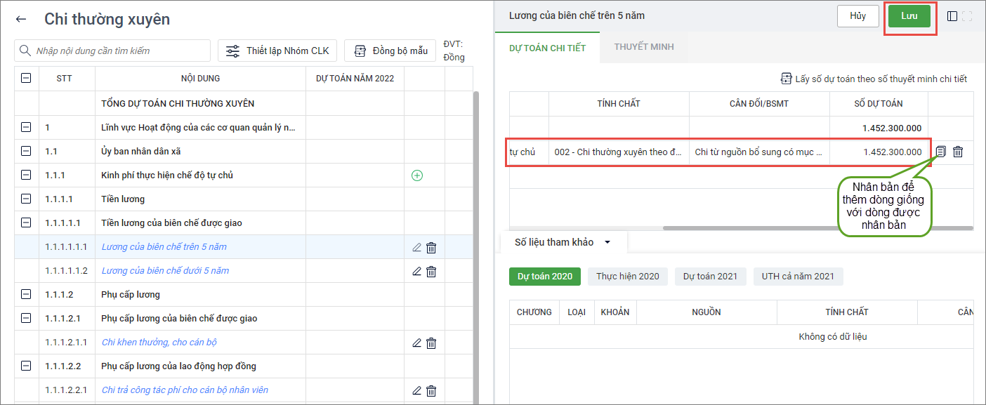 - Nếu muốn thêm một dòng chi tiết cho nội dung chi này có thể nhấn Thêm dòng, Nhân bản trong trường hợp anh/chị muốn thêm một dòng giống với dòng được thêm.