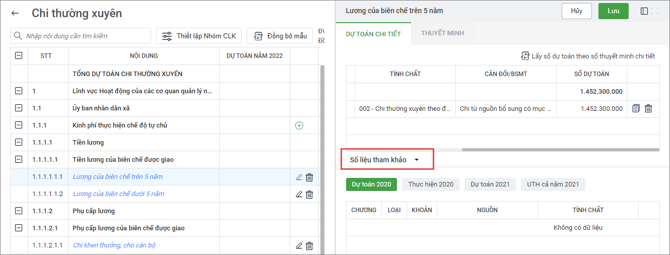 - Để có căn cứ lập dự toán cho nhiệm vụ chi năm kế hoạch, anh/chị có thể tham khảo số liệu năm trước tại tab Số liệu tham khảo.