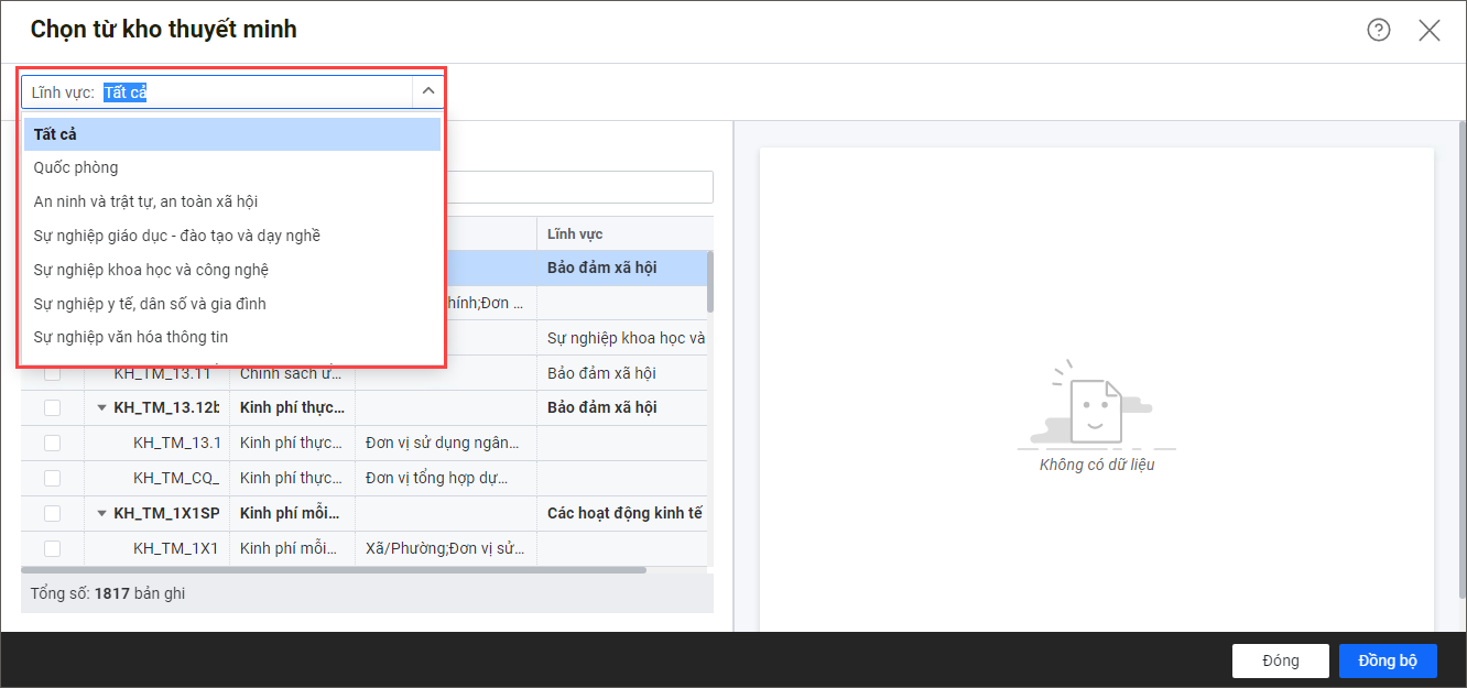 – Kể từ phiên bản R9: Phần mềm bổ sung bộ lọc Lĩnh vực và cột Lĩnh vực tại kho thuyết minh.