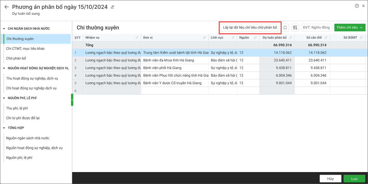 – Trước phiên bản R10: Đơn vị chủ quản có thể tạo Phương án phân bổ bổ sung cho các đơn vị trực thuộc tuy nhiên chưa cập nhật được số liệu mới nhất cho bảng Chỉ tiêu chờ phân bổ Chi thường xuyên.