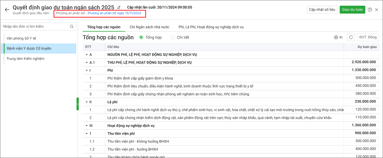 Tại các màn hình giao dự toán thể hiện thông tin Phương án phân bổ tương ứng với Quyết định giao.