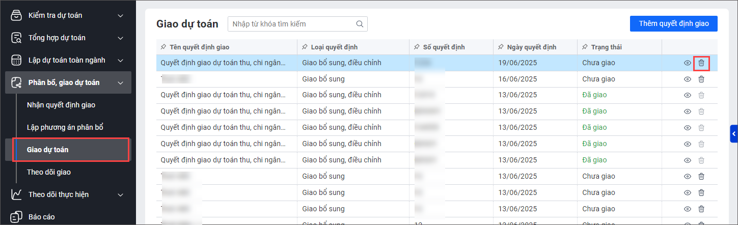 • Tại danh sách Giao dự toán, nhấn Xóa tại quyết định giao dự toán bổ sung, điều chỉnh đã tạo (trạng thái Chưa giao).