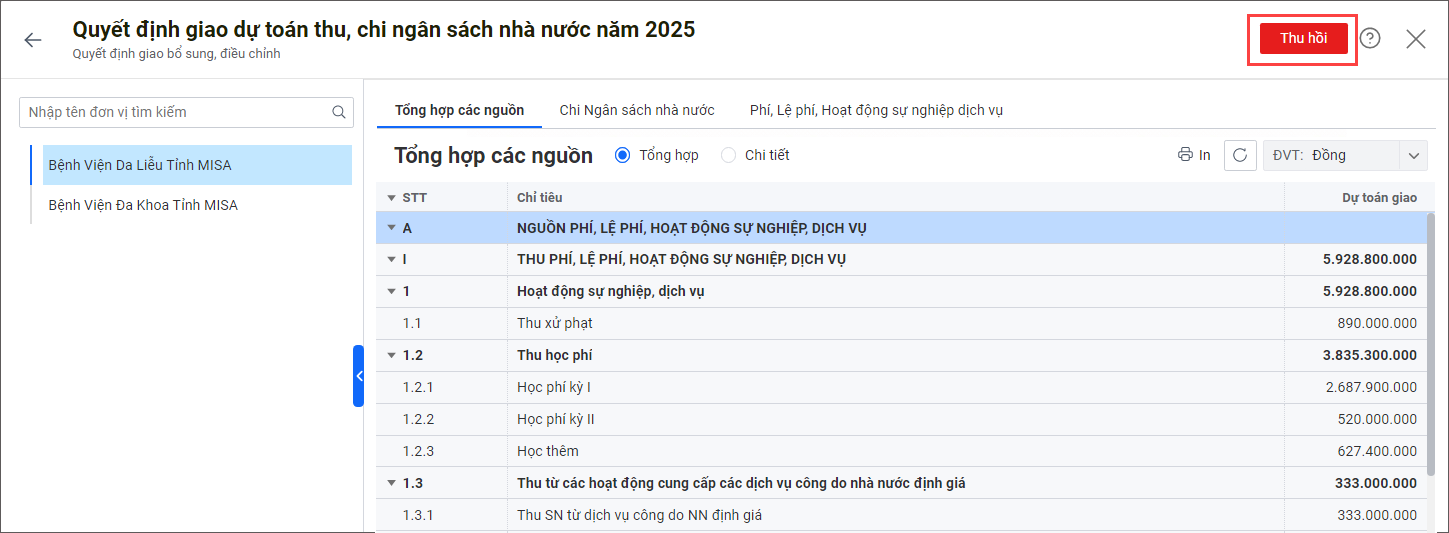 • Tại màn hình xem chi tiết quyết định giao đã giao xuống cho các đơn vị trực thuộc (trạng thái Đã giao), nhấn Thu hồi để lấy lại quyết định giao.