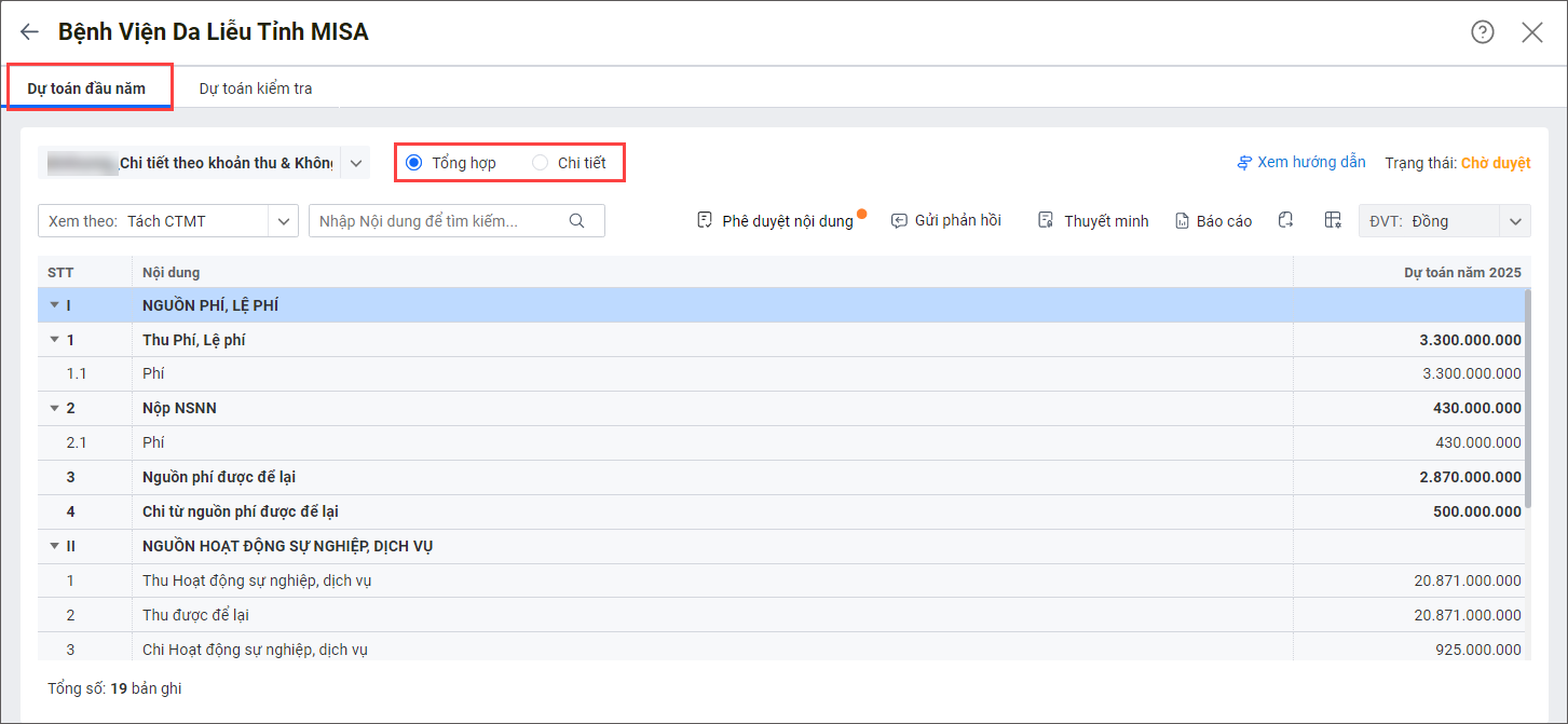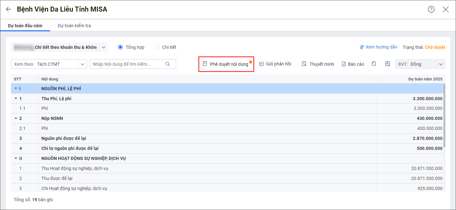 1. Tại tab Dự toán đầu năm, nhấn Phê duyệt nội dung.