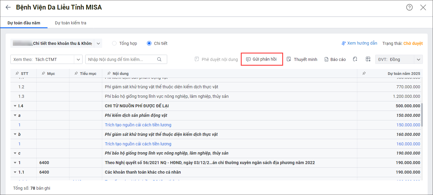 5. Sau khi xem dự toán đầu năm, đơn vị có thể gửi phản hồi cho cấp dưới trong trường hợp cấp dưới không có nội dung cần phê duyệt hoặc có nội dung cần phê duyệt nhưng chưa tạo biên bản kiểm tra,…