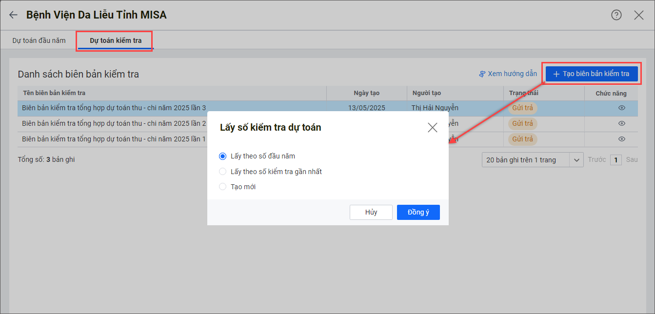 - Lấy theo số đầu năm: Biên bản kiểm tra được tạo với toàn bộ thông tin lấy theo bảng Dự toán đầu năm của lần nộp lên gần nhất.