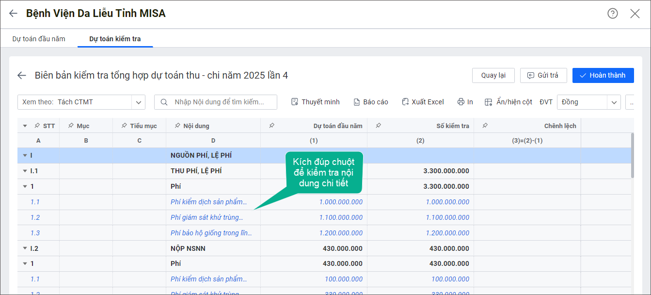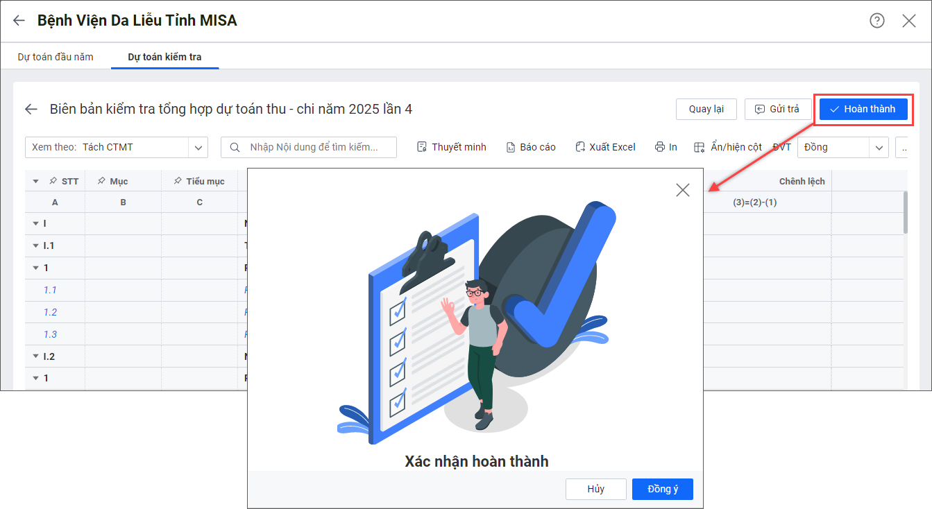 – Đã hoàn thành: Xem các đơn vị đã hoàn thành kiểm tra dự toán.