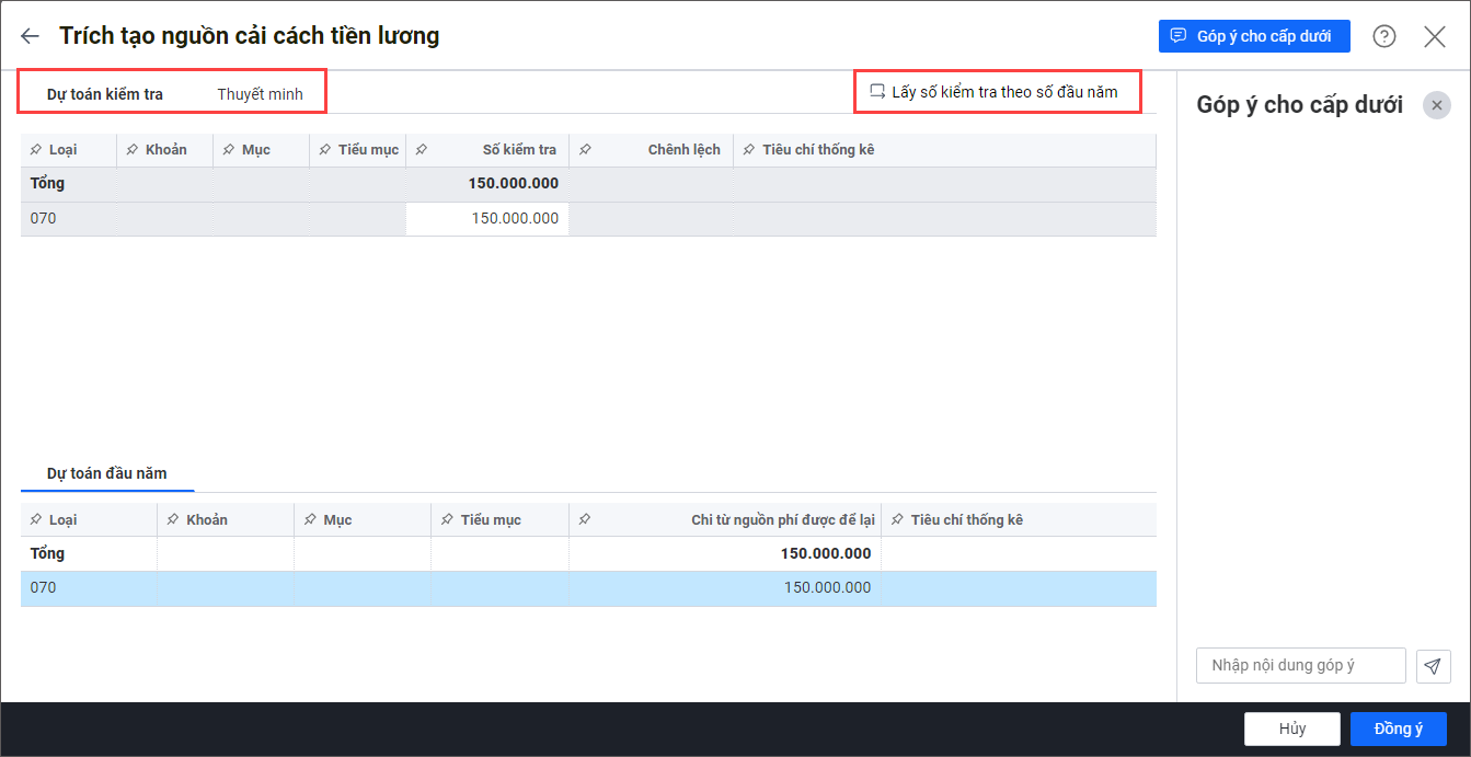 - Nếu dự toán đầu năm mà cấp dưới gửi lên đã đúng và đủ thì anh/chị có thể lấy nhanh số kiểm tra theo số đầu năm để không phải nhập lại.