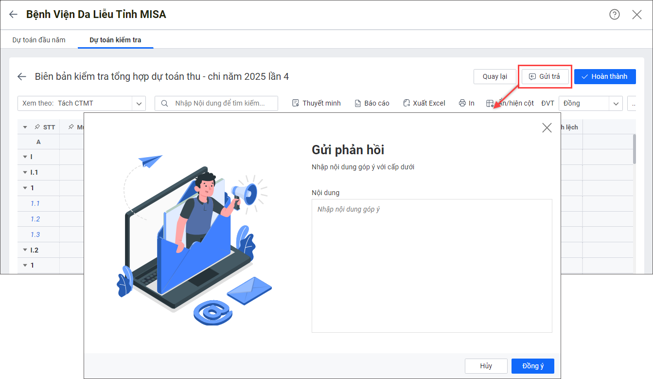 - Nhấn Đồng ý để xác nhận hoàn thành kiểm tra dự toán và không gửi trả cho cấp dưới.