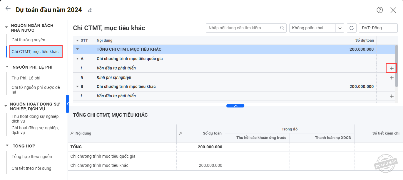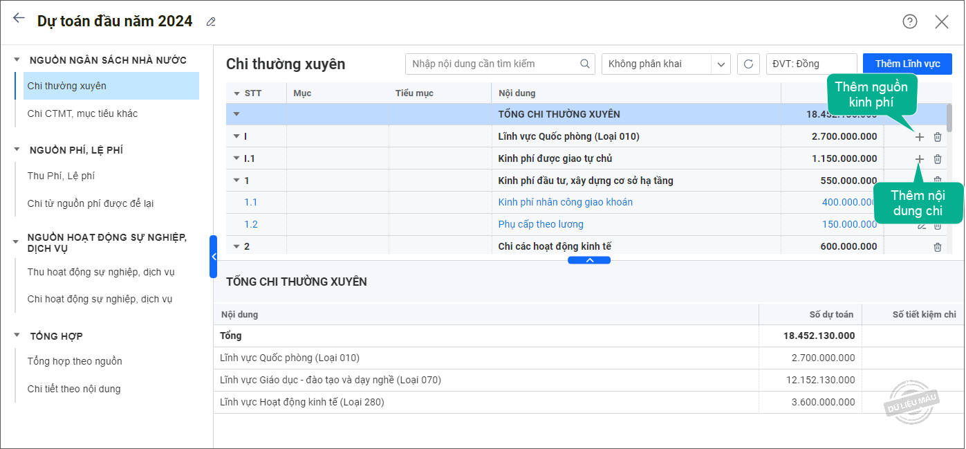 4. Để thêm nội dung chi thường xuyên, nhấn vào dấu + (như ảnh).