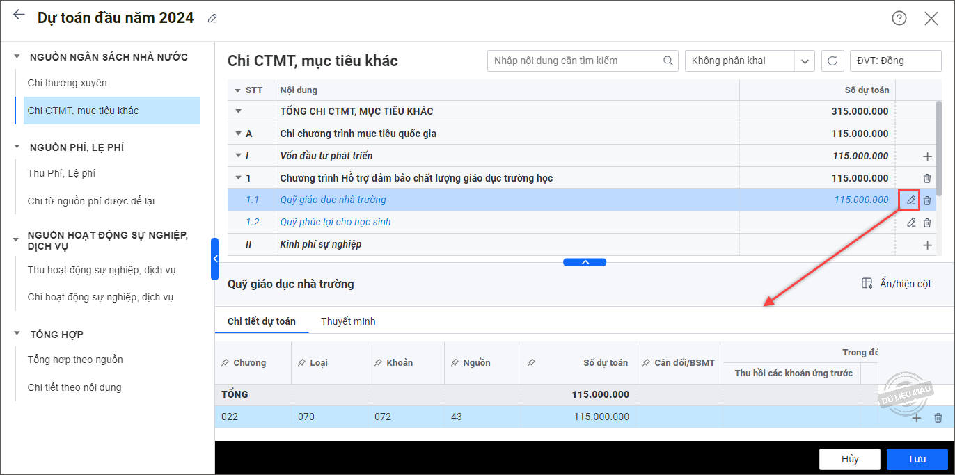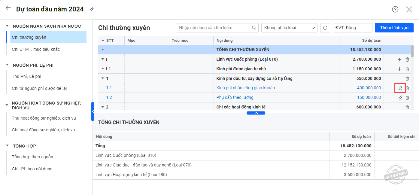 5. Nhấn Sửa tại nội dung chi cần lập dự toán.