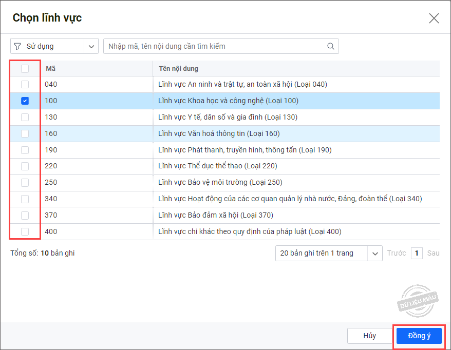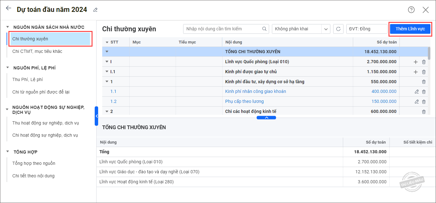 2. Trường hợp cần thêm lĩnh vực để lập dự toán, nhấn Thêm lĩnh vực.