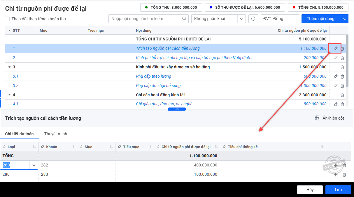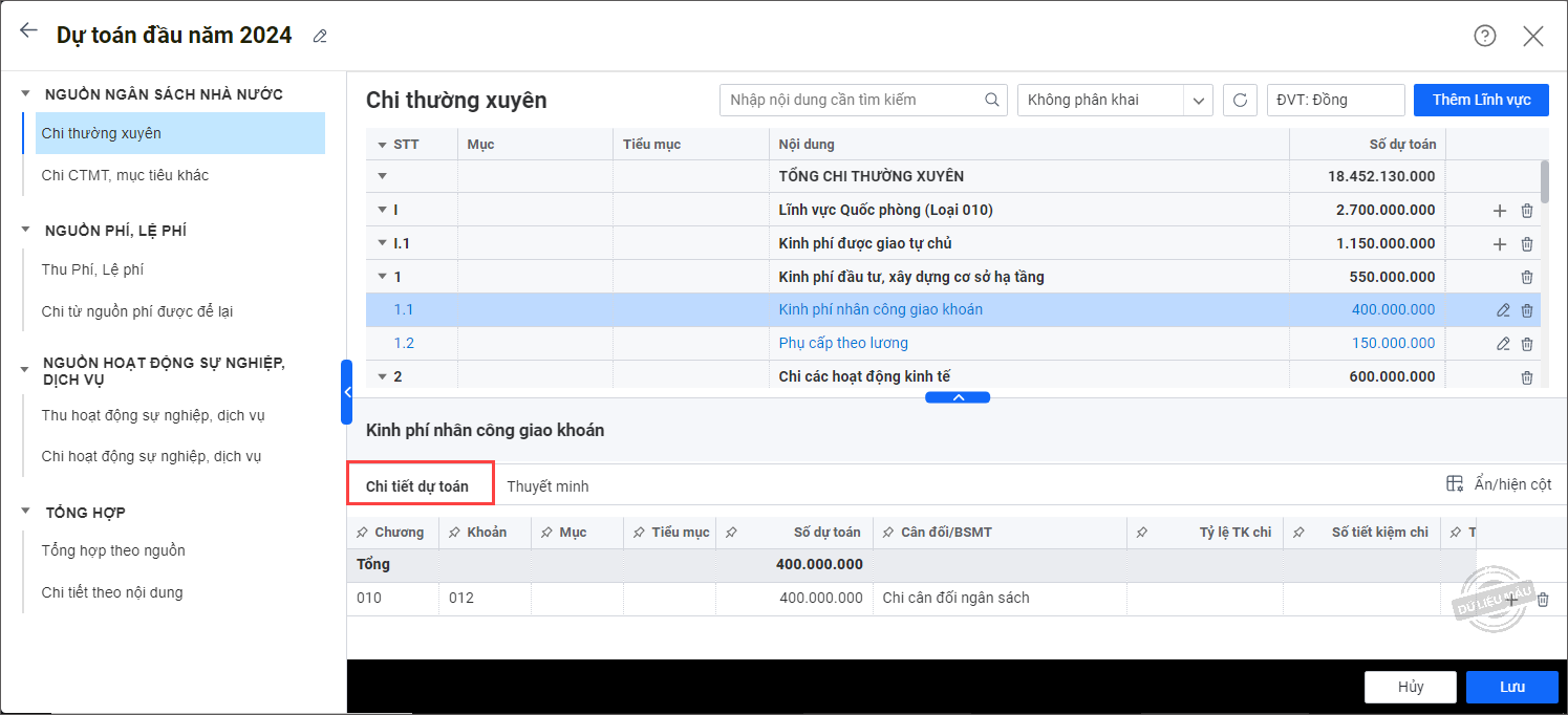 - Hệ thống sẽ tự động cập nhật Số dự toán của ô vừa chọn sang ô Tổng dự toán tại tab Chi tiết dự toán.